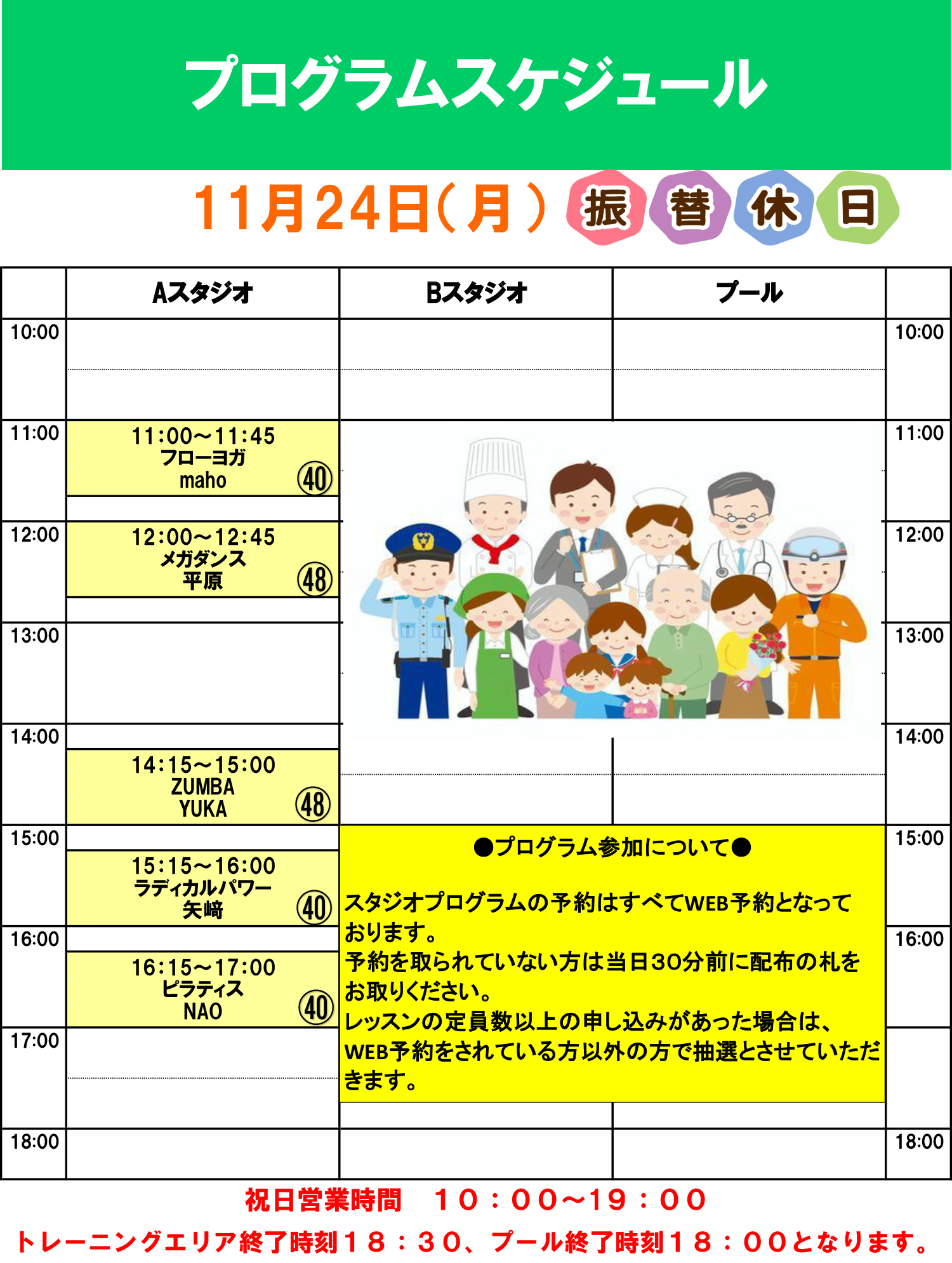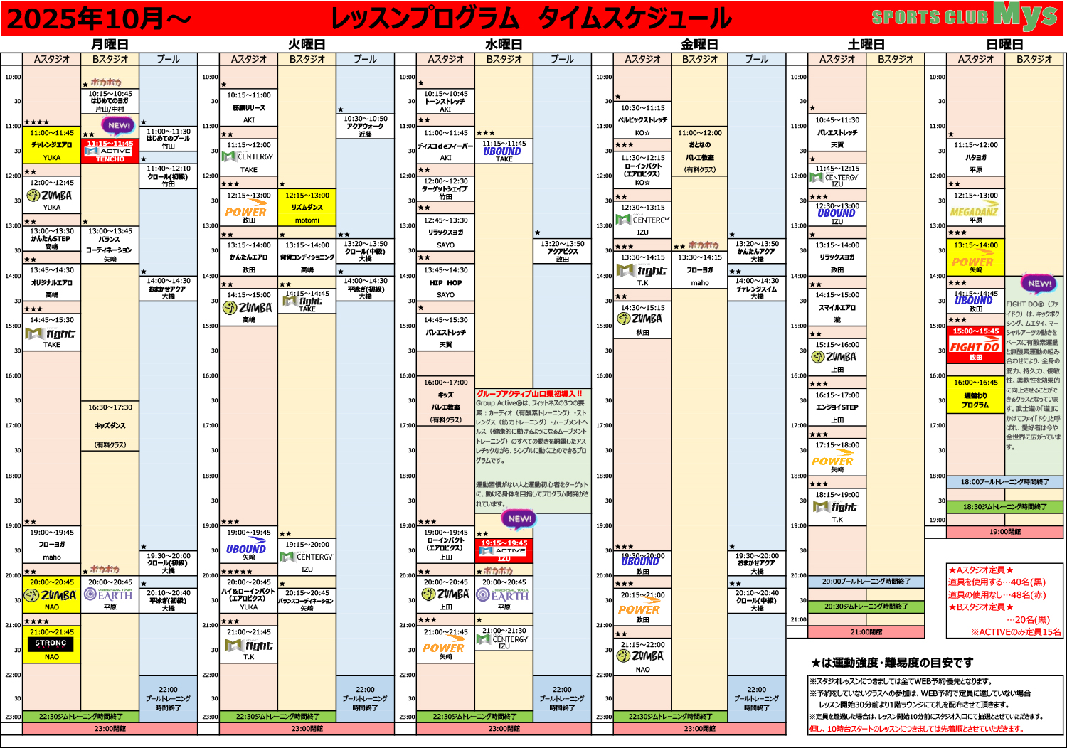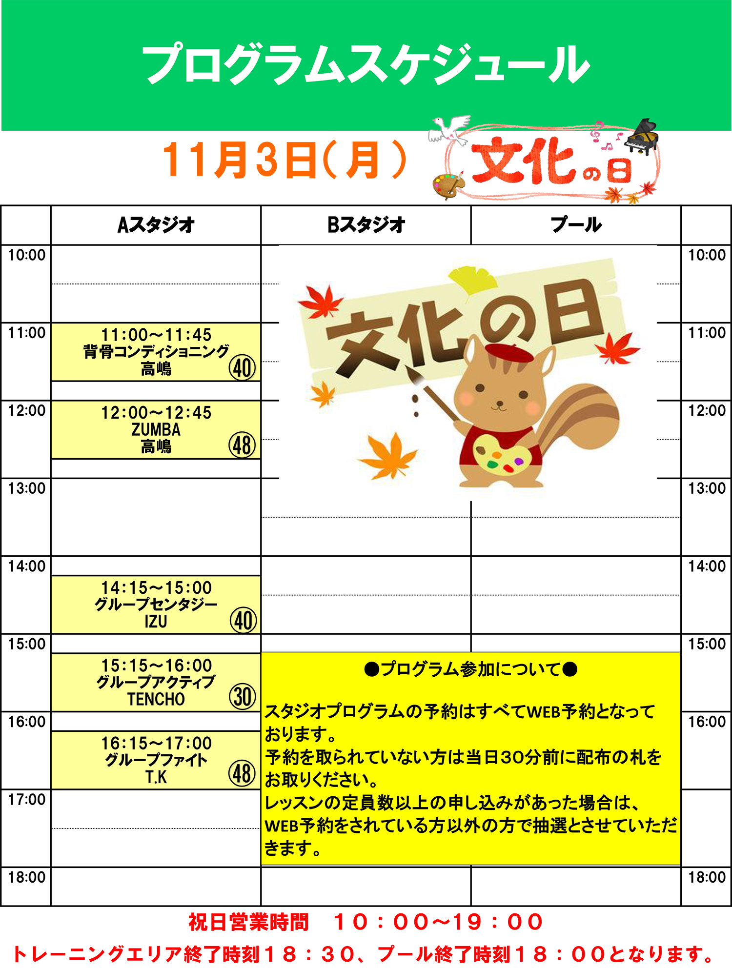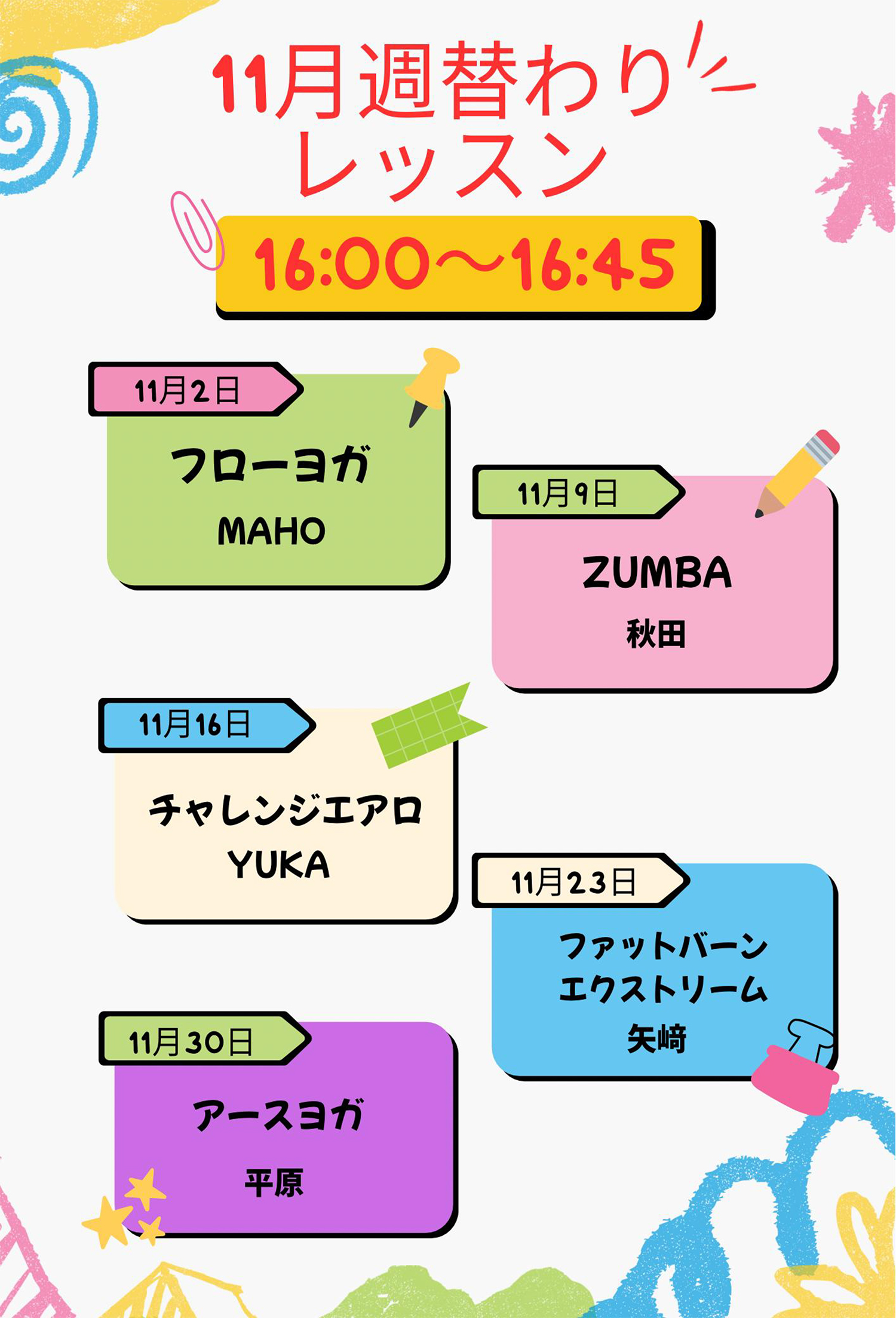 お知らせ 2025.09.16 2025年10月プログラムスケジュール更新! プログラムスケジュール(会員向け) ~ 2025年10月 ~ 週替わりレッスン ~ 2025年11月 ~ 祭日レッスン ~ 2025年11月3日 ~ 祭日レッスン ~ 2025年11月24日 ~